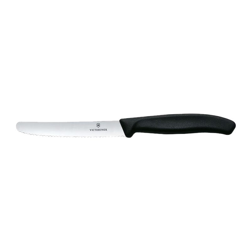 The Victorinox Tomato/Sausage Knife is the perfect addition to any kitchen, whether professional or home-based. This cost-effective option features a renowned Swiss stainless steel blade paired with a sleek black handle.